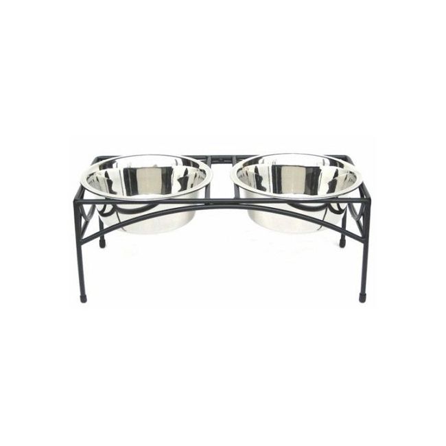 Features: Size: 21" L x 9.5" W x 12" H3 Quart CapacityIncludes durable wrought iron standSturdy ConstructionStainless steel bowlsRounded sides keep food and water centeredLarge bowl opening enable easy refillingDetachable bowls for easy cleaningNo sharp edgesThe Regal Double Elevated Dog Bowl is a stylish elevated dog bowl that is an absolute must have for your pet's happiness and health! The Regal Double Diner is a simple, elegant, back to the basics design, while still being modern and stylish. Non-skid plastic tips on legs. Elevated dog bowls are a necessity to your pet's health because they allow your pet to eat without crouching down in an uncomfortable posture. Elevated dog feeders improve back pain and neck pain. They also aid in reducing gas because your pet is able to eat in a natural position.